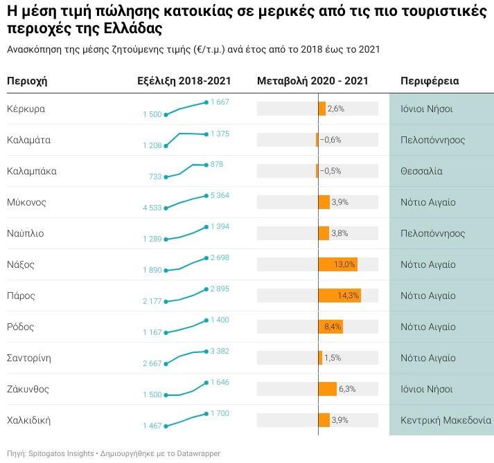 Την εικόνα της τάσης των τιμών από το 2018 μέχρι και τους τέσσερις πρώτους μήνες του 2022 για μερικούς από τους πιο δημοφιλείς τουριστικούς προορισμούς της Ελλάδας ανέλυσε το Spitogatos Insights με βάση τον δείκτη τιμών του Spitogatos (SPI), που καταγράφει τη χρονική εξέλιξη των τιμών στην εγχώρια αγορά ακινήτων.