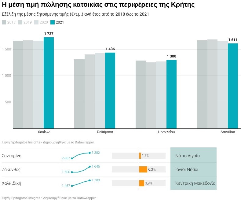 Όσον αφορά στην Κρήτη, και το πρώτο τετράμηνο του 2022 οι περιφέρειες Χανίων και Λασιθίου τοποθετούνται υψηλότερα ως προς τη μέση ζητούμενη τιμή πώλησης κατοικιών, ενώ η Περιφέρεια Ηρακλείου αναδεικνύεται οικονομικότερη σε σχέση με τις υπόλοιπες τρεις περιφέρειες της μεγαλονήσου.
