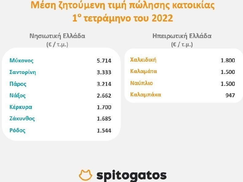 Το πρώτο τετράμηνο του τρέχοντος έτους, η Μύκονος αναδεικνύεται στην τουριστική περιοχή με τις υψηλότερες ζητούμενες τιμές πώλησης κατοικίας στα 5.714 €/τ.μ.. Ακολουθεί η Σαντορίνη με μέση ζητούμενη τιμή 3.333 €/τ.μ. αντίστοιχα.