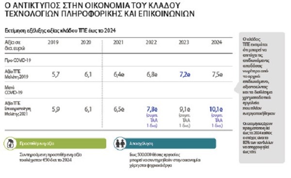Είναι χαρακτηριστικό ότι η Deloitte σε έκθεση που συνέταξε για λογαριασμό του Συνδέσμου Επιχειρήσεων Πληροφορικής & Επικοινωνιών (ΣΕΠΕ) εκτιμά ότι ο κλάδος μπορεί να εισφέρει έως το 2024 προστιθέμενη αξία 50 δισ. ευρώ στην ελληνική οικονομία και 500.000 νέες θέσεις εργασίας!