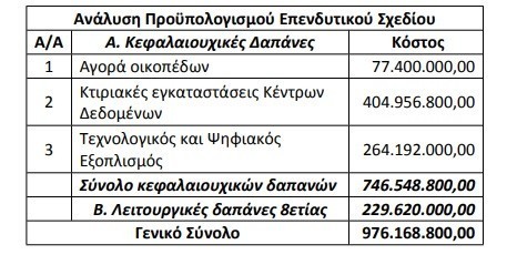 Το συνολικό κόστος του επενδυτικού σχεδίου βάσει του υποβληθέντος επενδυτικού φακέλου, ανέρχεται σε 976,168 ευρώ χωρίς το ΦΠΑ και αφορά αφενός στις κεφαλαιουχικές δαπάνες αγοράς των οικοπέδων, ανέγερσης των κτιριακών εγκαταστάσεων και αγοράς του απαραίτητου εξοπλισμού (software, hardware, servers κ.α.) ποσού 746,549 εκατ. ευρώ και αφετέρου στις λειτουργικές δαπάνες για χρονικό διάστημα οκταετίας ποσού 229,620 εκατ. ευρώ οι οποίες περιλαμβάνουν δαπάνες μισθοδοσίας, δαπάνες διαχείρισης εγκαταστάσεων, συντήρησης κ.α.