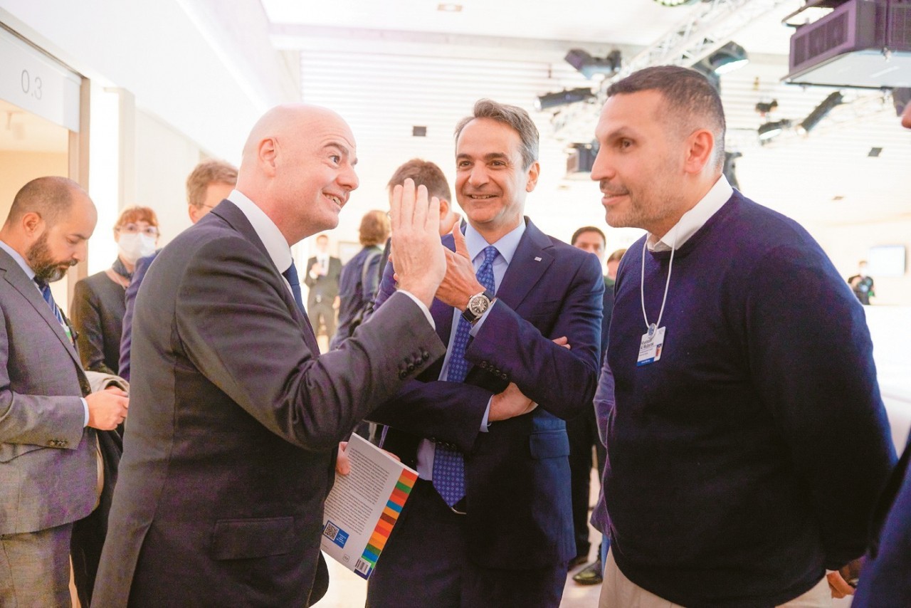 *Στη φωτογραφία ο πρωθυπουργός Κυριάκος Μητσοτάκης στις εργασίες του Παγκόσμιου Οικονομικού Φόρουμ στο Νταβός της Ελβετίας με τον πρόεδρο της FIFA Τζάνι Ινφαντίνο και τον πρόεδρο της Μάντσεστερ Σίτι Καλντούν αλ Μουμπάρακ