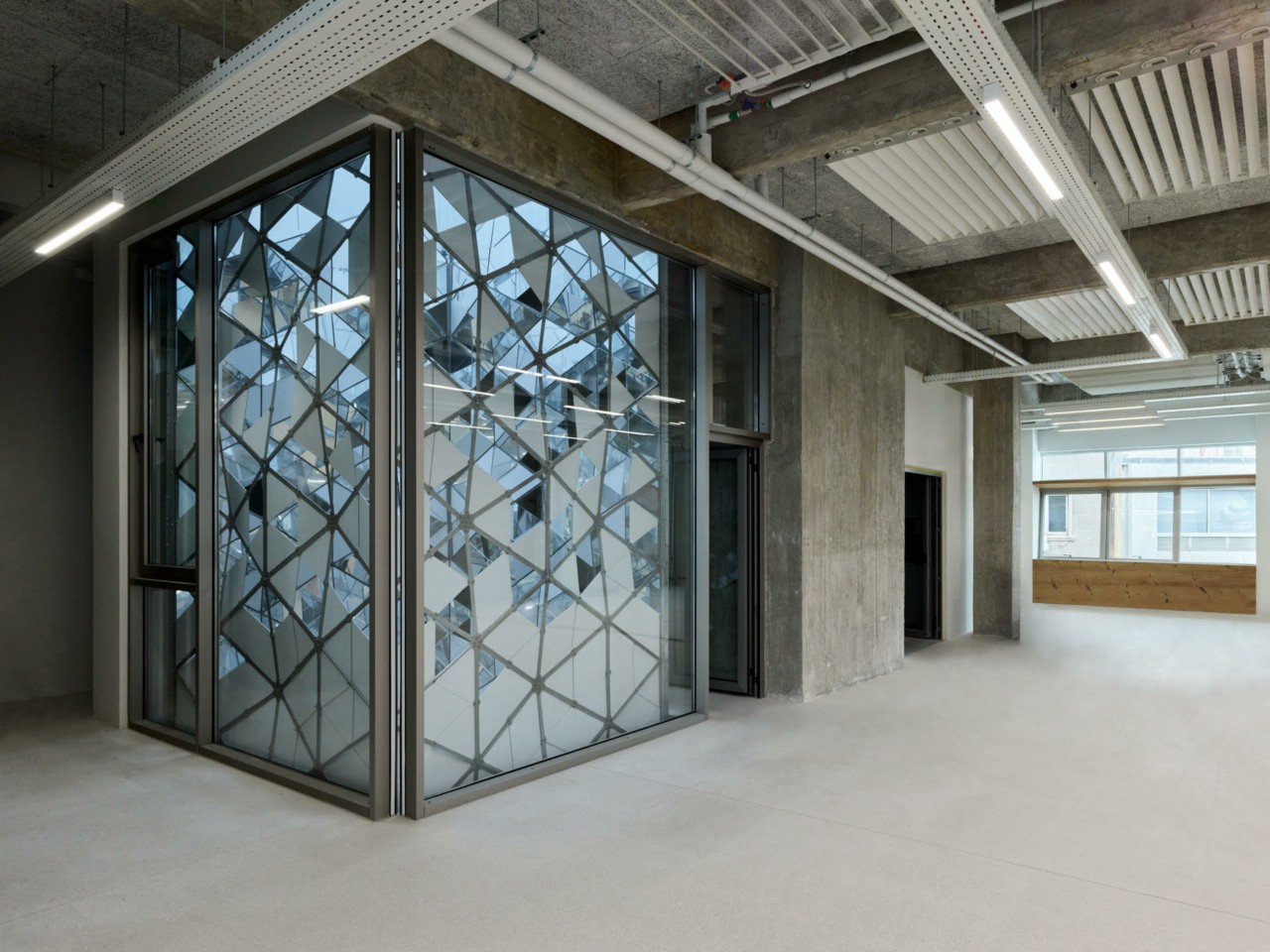 Ακόμη, τα ηλιακά ράφια παρέχουν σκίαση από τον ήλιο και μειώνουν την αντανάκλαση στα παράθυρα χωρίς να εμποδίζουν τη θέα, καθώς είναι τοποθετημένα πάνω από το επίπεδο των ματιών. Κατά τη διάρκεια των δεκαετιών, η όψη του κτιρίου είχε υποστεί πολλές αλλαγές, με την αντανάκλαση και την προστασία από τον ήλιο να παραμένουν σημαντικές προκλήσεις. Παλαιότερα, εντελώς απροστάτευτο από τον ήλιο, το κτίριο είχε υπερβολικά φορτία ψύξης και μη βιώσιμη κατανάλωση ηλεκτρικής ενέργειας το καλοκαίρι. Τώρα, η νέα όψη, κατασκευασμένη από βιώσιμα παραγόμενο ξύλο, παρέχει σκίαση από τον ήλιο και ρυθμίζει την είσοδο του φυσικού φωτός με ειδικά σχεδιασμένα σκίαστρα. Τέλος, το δώμα με τα φωτοβολταϊκά παράγει πράσινη ηλεκτρική ενέργεια, μειώνοντας τις εκπομπές διοξειδίου του άνθρακα.