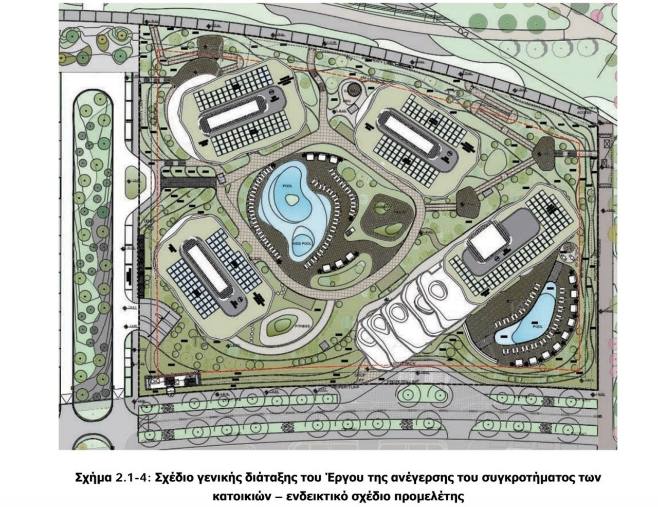 Η συνολική μέγιστη δυναμικότητα φιλοξενίας του συγκροτήματος είναι περίπου 1.570 άτομα εκ των οποίων ο μέγιστος αριθμός κατοίκων είναι περίπου 1.460 άτομα. Σε τυπικές συνθήκες πληρότητας εκτιμάται ένα ποσοστό 70% (περί τα 1.020 άτομα) ως καθημερινοί χρήστες. Όπως υποστηρίζεται στη μελέτη «στρατηγικά για την αποφυγή συμπαγούς δόμησης και την αρμονία με το πνεύμα της συνολικότερης ανάπτυξης επιλέγεται η κατασκευή περισσοτέρων του ενός κτιρίων, και συγκεκριμένα 4 κτιρίων για τη δημιουργία μιας οικείας εμπειρίας και κλίμακας και συγχρόνως για την βέλτιστη αξιοποίηση του περιβάλλοντα χώρου, σε συνέργεια με το Μητροπολιτικό Πάρκο και τους λοιπούς χώρους πρασίνου της περιοχής. Η διάταξη αυτή παρέχει συγχρόνως την ευκαιρία να επεκταθεί το τοπίο και κάτω από τα κτίρια με μεγιστοποίηση του υπαίθριου χώρου». Σε αυτή τη φάση της περιβαλλοντικής αδειοδότησης, προβλέπεται και η κοπή 3 υφιστάμενων δένδρων «το σύνολο των οποίων δεν είναι δυνατόν να μεταφυτευτούν, καθ’ όσον αυτά παρουσιάζουν εκτεταμένη φθορά, με ολόκληρα τμήματά τους ξερά ή με προσβολές από ασθένειες».