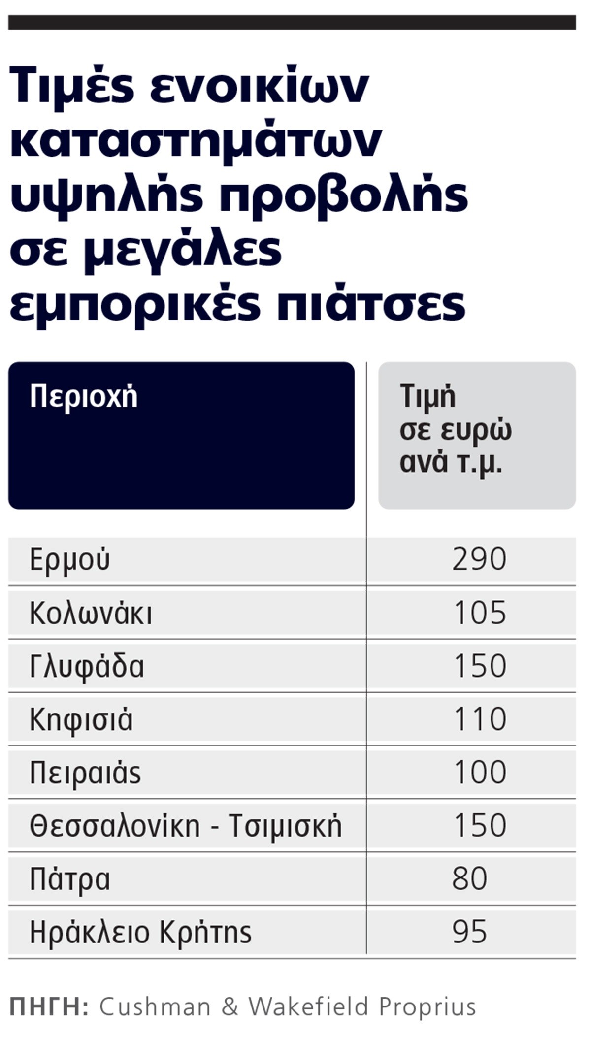 Ως προς τα ενοίκια, στις υπόλοιπες εμπορικές πιάτσες, τα πιο ακριβά ακολουθούν, με βάση την ανάλυση της Cushman & Wakefield Proprius, στην εμπορική πιάτσα της Γλυφάδας που υποδέχθηκε φέτος το πρώτο κατάστημα στην Ελλάδα των Weekend MaxMara και την Τσιμισκή στη Θεσσαλονίκη, που επίσης έχει παρουσιάσει φέτος μεγάλη κινητικότητα, μεταξύ άλλων, με το νέο κατάστημα 10 επιπέδων και επιφάνειας 2.000 τ.μ. των Marks & Spencer στον αριθμό 55 από τον αριθμό 45 όπου επεκτείνεται το νέο mega Zara, πέραν και της αλυσίδας ηλεκτρονικών ειδών Loewe που έκανε ντεμπούτο στην Ελλάδα από τη Θεσσαλονίκη στις αρχές του καλοκαιριού. Τα ενοίκια, τόσο στη Γλυφάδα όσο και στην Τσιμισκή, αντιστοιχούν στα 150 ευρώ ανά τ.μ. τον μήνα, έχοντας παρουσιάσει ειδικά για την περίπτωση της Τσιμισκή μικρή αύξηση σε σύγκριση με πέρυσι, οπότε το αντίστοιχο νούμερο ήταν στα 145 ευρώ. Στο Κολωνάκι οι τιμές διαμορφώνονται τώρα κοντά 105 ευρώ ανά τ.μ. και λίγο ψηλότερα, στα 110 ευρώ ανά τ.μ., στην Κηφισιά. Αυξητικά, φτάνοντας τα 100 ευρώ ανά τ.μ. κινείται ο Πειραιάς, όπου η σημαντικότερη νέα άφιξη φέτος ήταν το κατάστημα-ναυαρχίδα των 5.000 τ.μ. του ομίλου Inditex (Ζara) στον ολοκαίνουριο Πύργο Πειραιά.