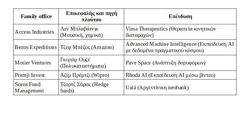 Παρά το πιο επιφυλακτικό περιβάλλον, ορισμένα family offices παραμένουν ιδιαίτερα δραστήρια. Τον Μάρτιο, το επενδυτικό γραφείο του Ινδού δισεκατομμυριούχου Αζίμ Πρέμτζι πραγματοποίησε τουλάχιστον τέσσερις άμεσες επενδύσεις, σύμφωνα με τη Fintrx.