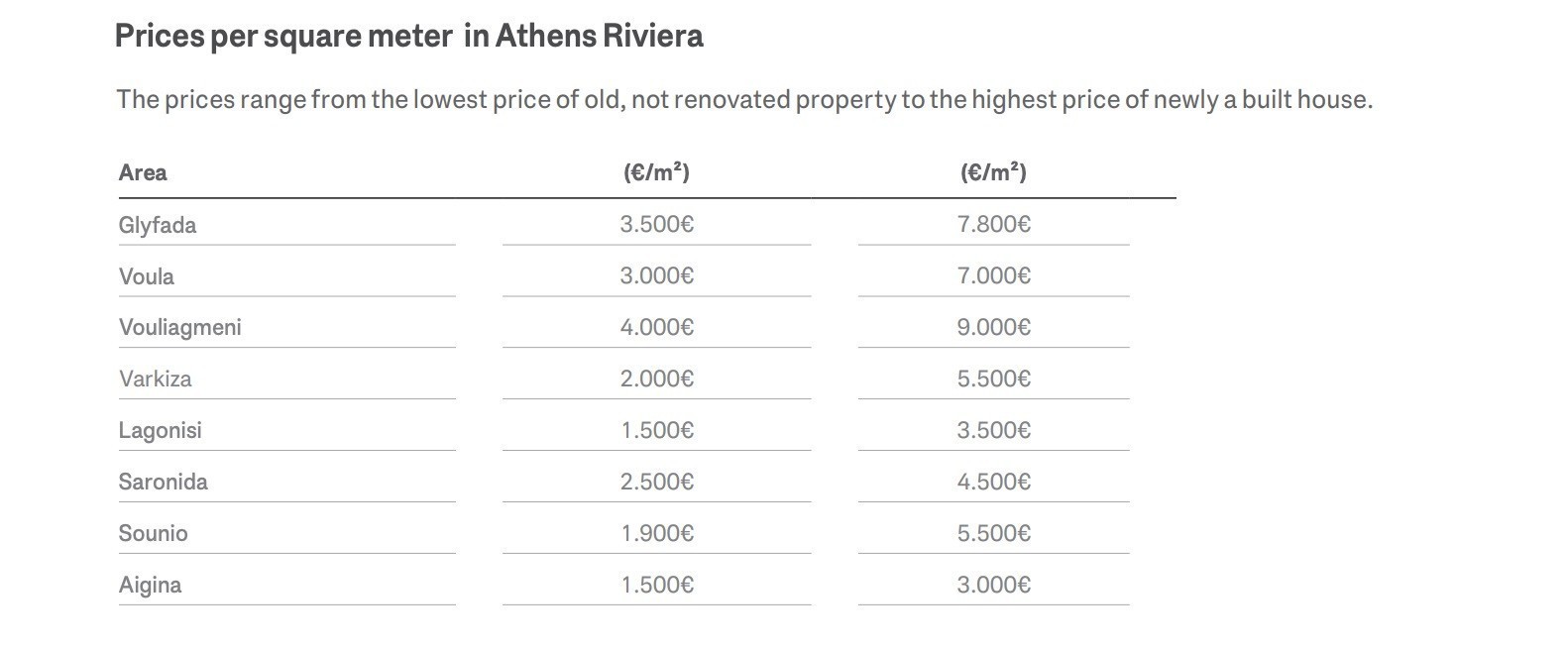 Ως προς τις τιμές, τα υψηλότερα νούμερα καταγράφονται στη Βουλιαγμένη όπου οι χαμηλότερες τιμές για μη ανακαινισμένα σπίτια είναι στις 4.000 ευρώ ανά τ.μ. ενώ για τα καινούρια σπίτια η τιμή υπερδιπλασιάζεται στις 9.000 ευρώ ανά τ.μ.. Αντίστοιχα συμβαίνει και στη Γλυφάδα με τιμές από 3.500 ευρώ ανά τ.μ. για τα παλιά έως τις 7.800 ευρώ ανά τ.μ., ενώ τα πιο φθηνά σπίτια από 1.500 ευρώ ανά τ.μ. και πάνω στο παραλιακό μέτωπο της Αθήνας συναντώνται στο Λαγονήσι.