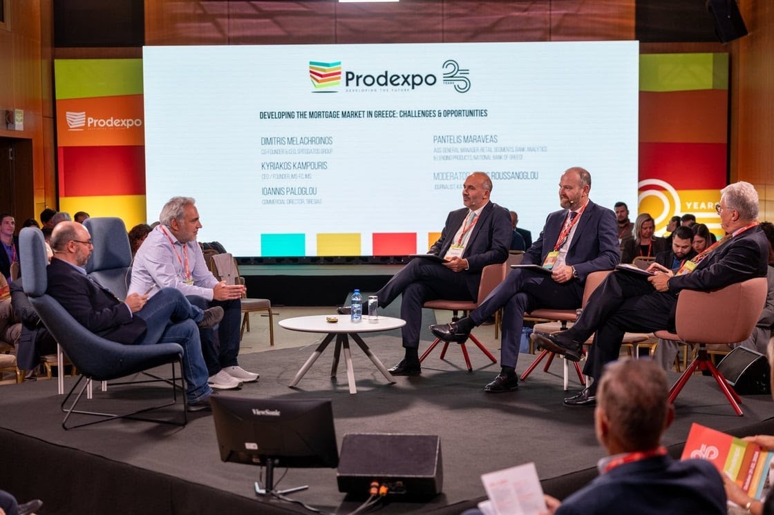 Κεντρική φωτο κειμένου – από αριστερά: Νίκος Ρουσάνογλου, Δημοσιογράφος, Καθημερινή, Δημήτρης Μελαχροινός, Co- Founder & CEO του Spitogatos Group, Παντελής Μαραβέας, Ass. General Manager, Retail Segments, Bank Analytics & Lending Products της Εθνικής Τράπεζας της Ελλάδος, Κυριάκος Καμπούρης, ιδρυτής και διευθύνων σύμβουλος του IMS-FC, Ιωάννης Παλόγλου, Εμπορικός Διευθυντής της Tiresias