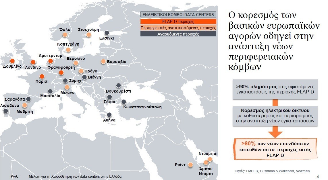 Την ίδια στιγμή, οι βασικοί ευρωπαϊκοί κόμβοι data centers, όπως το Λονδίνο, το Δουβλίνο, η Φρανκφούρτη, το Παρίσι και το Άμστερνταμ, εμφανίζουν υψηλό βαθμό κορεσμού.