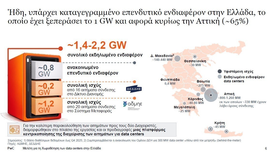 Συνολικά έχουν κατατεθεί περισσότερα από 35 αιτήματα σύνδεσης, από hyperscalers, παρόχους data centers, ενεργειακές εταιρείες και επενδυτές υποδομών, ενώ περίπου το 35% έχει ήδη λάβει όρους σύνδεσης. Το μεγαλύτερο μέρος των σχεδίων αφορά την Αττική, ενώ επενδυτικό ενδιαφέρον καταγράφεται επίσης στη Θεσσαλονίκη, τη Δυτική Μακεδονία, τη Βοιωτία, την Κόρινθο, τη Μεγαλόπολη και την Κρήτη.
