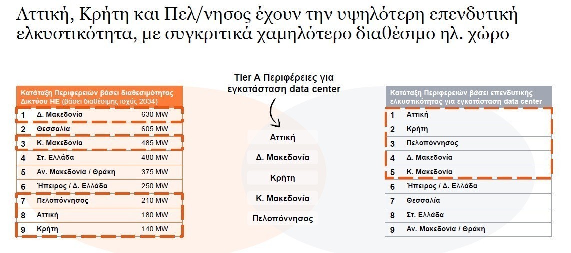 Ωστόσο, η μελέτη επισημαίνει μια κρίσιμη ανισοκατανομή μεταξύ περιοχών υψηλής ζήτησης και περιοχών με διαθέσιμη ισχύ. Η Αττική συγκεντρώνει το μεγαλύτερο επενδυτικό ενδιαφέρον για νέα data centers, αλλά εμφανίζει περιορισμένο ηλεκτρικό χώρο, την ώρα που μεγαλύτερη διαθεσιμότητα υπάρχει σε άλλες περιφέρειες όπως η Δυτική Μακεδονία, η Θεσσαλία και η Κεντρική Μακεδονία.