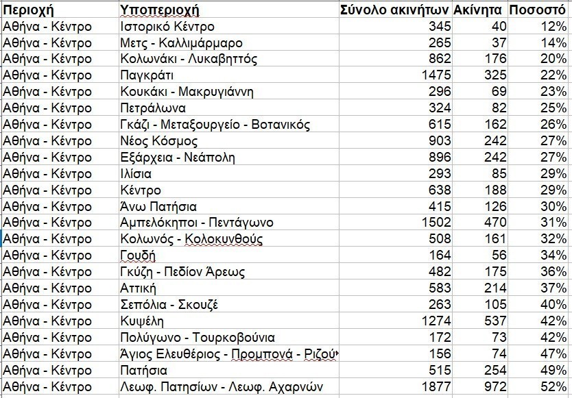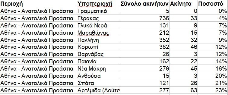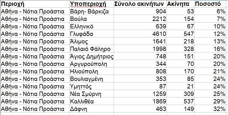 Στα νότια τα νούμερα κυμαίνονται από το 6% στη Βάρη- Βάρκιζα έως το 29% και το 32% στην Καλλιθέα και τη Δάφνη, ενώ στα ανατολικά της Αττικής τα Σπάτα και η Αρτέμιδα έχουν ποσοστά διαθεσιμότητας στο 21%- 23%.