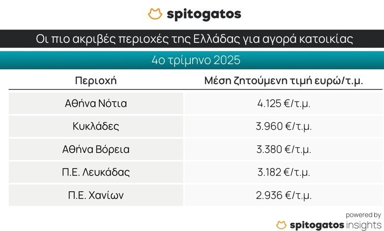 Τα πρωτεία των πιο ακριβών περιοχών της χώρας για αγορά κατοικίας συνεχίζουν να κατέχουν τα Νότια Προάστια, με ΜΖΤ στα 4.125 ευρώ/τ.μ., ενώ ακολουθούν οι Κυκλάδες και τα Βόρεια Προάστια. Το top 5 των πιο ακριβών σημείων της χώρας για αγορά κατοικίας συμπληρώνουν η Περιφερειακή Ενότητα (Π.Ε.) Λευκάδας και η Π.Ε. Χανίων, με ΜΖΤ στα 2.936 ευρώ/τ.μ.