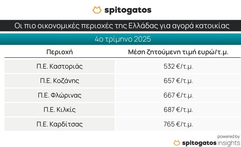 Στον αντίποδα, τα πιο οικονομικά σημεία της χώρας για αγορά κατοικίας είναι η Π.Ε. Καστοριάς με ΜΖΤ πώλησης κατοικίας στα 532 ευρώ/τ.μ., ενώ ακολουθούν οι Π.Ε. Κοζάνης, Φλώρινας, Κιλκίς και Καρδίτσας.
