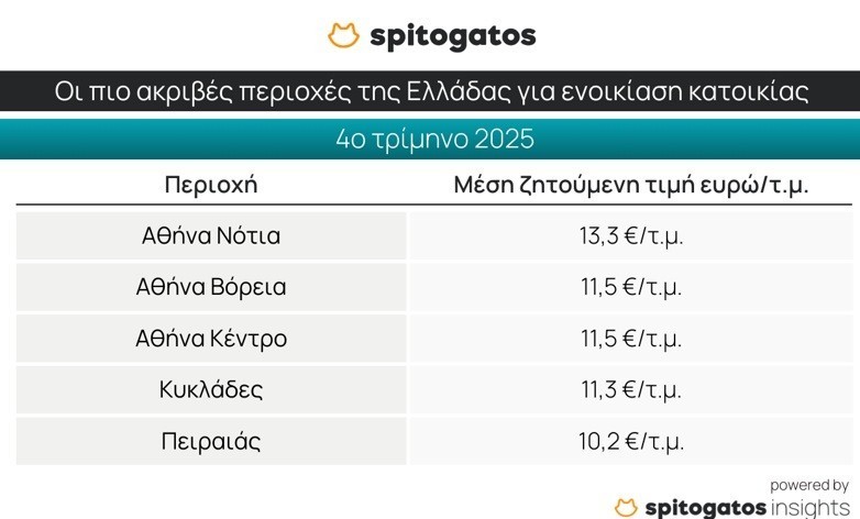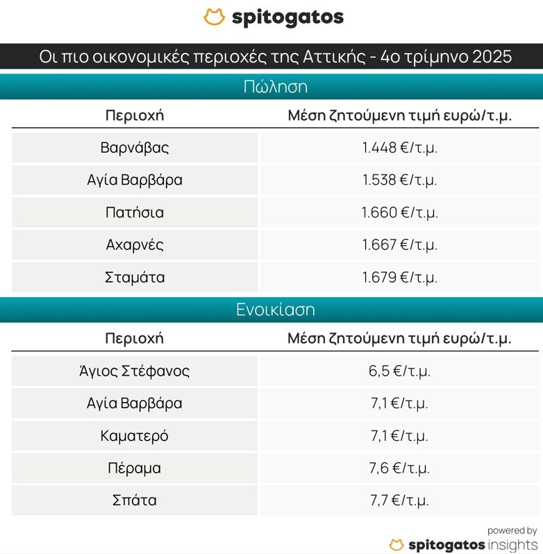 Οι πιο οικονομικές περιοχές για ενοικίαση κατοικίας στην Αττική κατά το 4ο τρίμηνο του 2025 είναι ο Άγιος Στέφανος στα Βόρεια Προάστια της Αθήνας, με ΜΖΤ στα 6,5 ευρώ/τ.μ., η Αγία Βαρβάρα και το Καματερό στα Δυτικά Προάστια, το Πέραμα στα Προάστια του Πειραιά και τα Σπάτα στην Ανατολική Αττική.