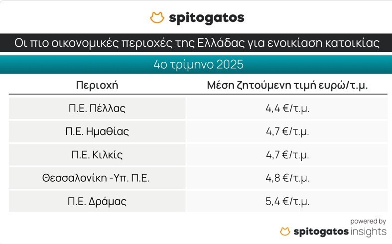Τα οικονομικότερα σημεία της Ελλάδας για ενοικίαση κατοικίας κατά το 4ο τρίμηνο του 2025 είναι οι Π.Ε. Πέλλας, Ημαθίας, Κιλκίς, το Υπόλοιπο της Περιφερειακής Ενότητας Θεσσαλονίκης και η Π.Ε. Δράμας.