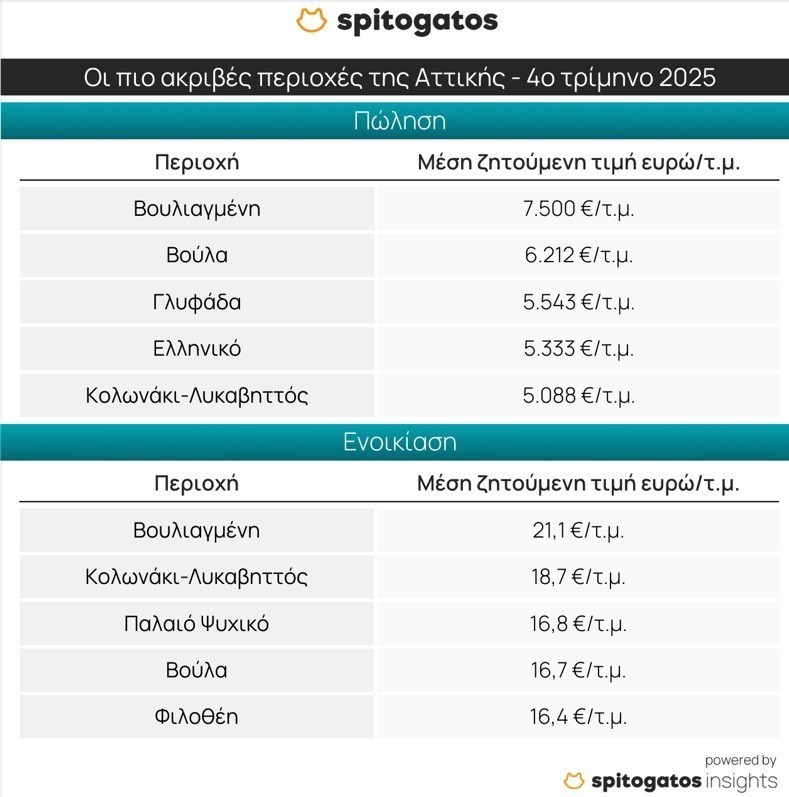 Σε ό,τι αφορά την ενοικίαση κατοικίας, και για το 4ο τρίμηνο του 2025, η Βουλιαγμένη αναδεικνύεται ως η ακριβότερη περιοχή της Αττικής, με ΜΖΤ ενοικίασης στα 21,1 ευρώ/τ.μ., τιμή αυξημένη κατά 5,7% σε σύγκριση με το 4ο τρίμηνο του 2024. Ακολουθούν οι περιοχές Κολωνάκι-Λυκαβηττός, Παλαιό Ψυχικό, Βούλα και Φιλοθέη, με ΜΖΤ που διαμορφώνεται στα 16,4 ευρώ/τ.μ. Στη Φιλοθέη καταγράφεται μείωση -8,0% σε ετήσια βάση, ενώ οι υπόλοιπες περιοχές της πρώτης πεντάδας σημειώνουν ετήσιες αυξήσεις που κυμαίνονται μεταξύ 2,9% και 12,0%.