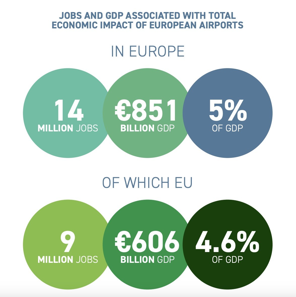 Τα ευρωπαϊκά αεροδρόμια και συνολικά η αεροπορική συνδεσιμότητα που παρέχουν, δημιουργούν άμεσα και έμμεσα 14 εκατομμύρια θέσεις εργασίας και 851 δισ. ευρώ παραγωγή σε ΑΕΠ, νούμερο το οποίο αντιστοιχεί στο 5% επί του συνολικού ευρωπαϊκού ΑΕΠ κάθε χρόνο.
