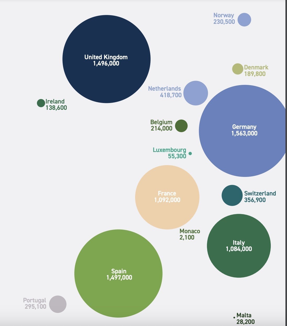 Ως προς τα νούμερα της Ελλάδας ειδικά ο συνολικός οικονομικός αντίκτυπος, άμεσος και έμμεσος, από το οικοσύστημα των αεροδρομίων και την αεροπορική συνδεσιμότητα υπολογίζεται στα 13,8 δισ. ευρώ σε ετήσια βάση με ένα σύνολο θέσεων εργασίας στις 286.800. Η χώρα μας συγκαταλέγεται στις πιο μικρές ευρωπαϊκές αγορές αν ληφθεί υπόψη ότι στην «πρωταθλήτρια» Γερμανία με μεγάλα αεροδρόμια- κόμβους, ο αριθμός των θέσεων εργασίας είναι στα 1,563 εκατομμύρια με 121 δισ. ευρώ παραγωγή στο ΑΕΠ. Στην Ισπανία τα νούμερα αντιστοιχούν στα 1,497 εκατ. απασχολούμενους και 82 δισ. ευρώ, στο Ηνωμένο Βασίλειο στα 1,496 εκατ. θέσεις εργασίας και παραγόμενο αντίκτυπο στα 106,8 δισ. ευρώ, ενώ ακολουθούν η Γαλλία και η Ιταλία, συμπληρώνοντας τις 5 μεγαλύτερες αγορές.