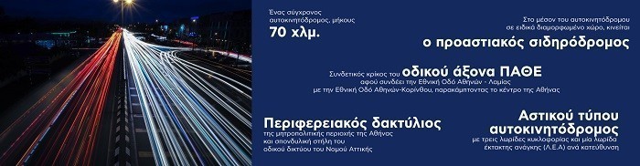 Η Αττική Οδός είναι ένας σύγχρονος αυτοκινητόδρομος μήκους περίπου 70 χλμ., που κατασκευάστηκε τη δεκαετία του 1990 με τη μέθοδο της παραχώρησης. Αποτελεί τον περιφερειακό της ευρύτερης μητροπολιτικής περιοχής της Αθήνας και τμήμα της σπονδυλικής στήλης του οδικού δικτύου του Νομού Αττικής.