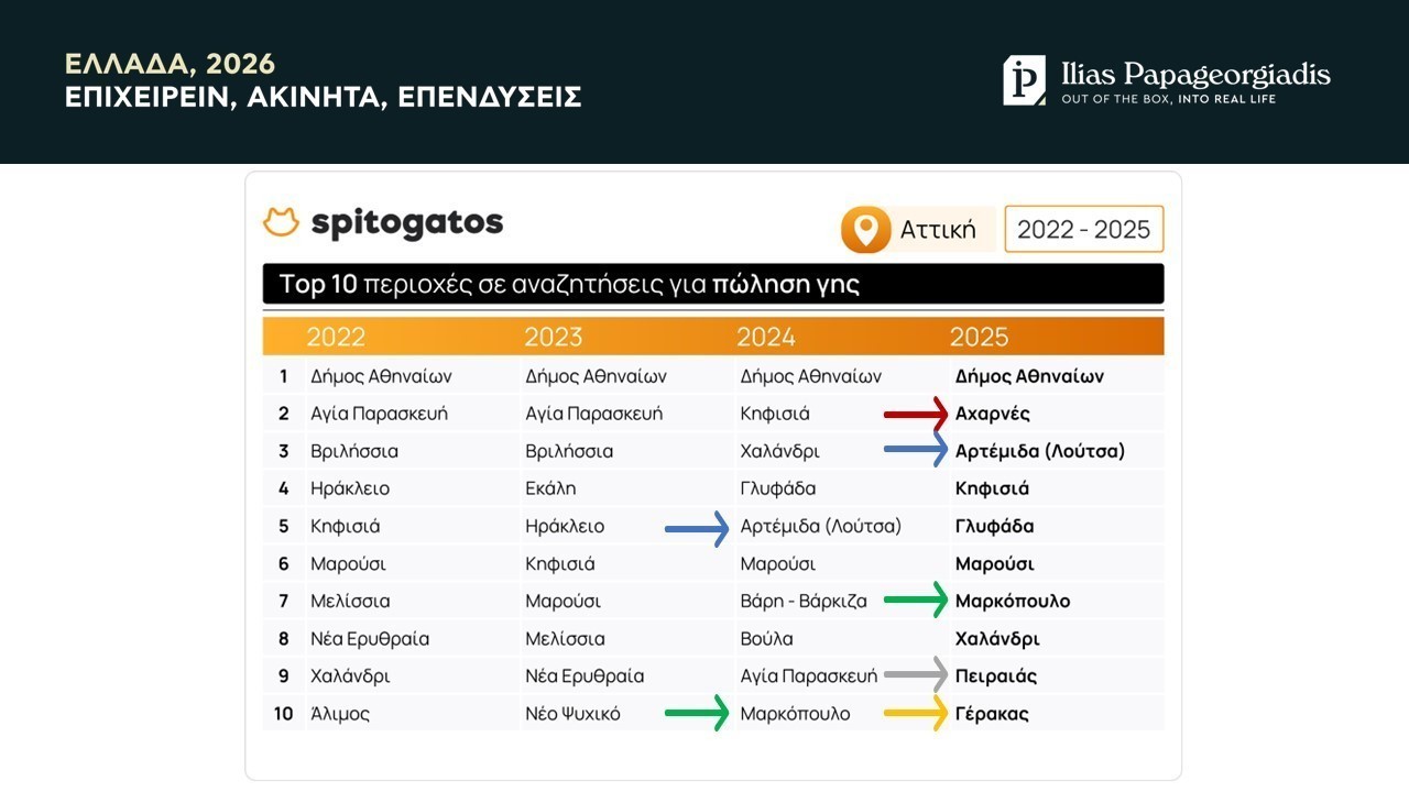 Την ίδια στιγμή, οι αναζητήσεις για γη στην Αττική ανέδειξαν επίσης πολύ σημαντικές μετατοπίσεις του ενδιαφέροντος των επενδυτών, με το ανατολικό «μέτωπο» της Αττικής να συγκεντρώνει πλέον σαφώς μεγαλύτερο ενδιαφέρον λόγω σαφώς καλύτερων τιμών. Πρώτος σε αναζητήσεις είναι και στην περίπτωση αυτή ο δήμος Αθηναίων, όμως η περιοχή της Αρτέμιδας και Λούτσας έφτασε στην 3η θέση (από 5η την προηγούμενη χρονιά), ενώ και το Μαρκόπουλο βρέθηκε στην 7η (από τη 10η). Το ενδιαφέρον για την ανατολική Αττική επιβεβαίωσε ότι η άνοδος του 2024 δεν ήταν παροδική και πλέον δείχνει να ενδιαφέρει όλο και μεγαλύτερο κοινό, σύμφωνα με τον CEO του Spitogatos.
