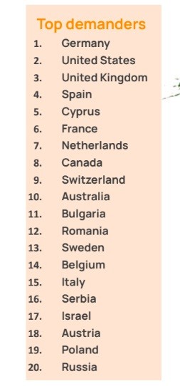 Τη δεκάδα των χωρών απ’ όπου προέρχεται ο μεγαλύτερος όγκος αναζητήσεων συμπληρώνουν η Γαλλία, η Ολλανδία, ο Καναδάς, η Ελβετία και η Αυστραλία, με τη Γαλλία μάλιστα να έχει παρουσιάσει μεγάλη άνοδο το τελευταίο διάστημα. Στην 20άδα περιλαμβάνονται ακόμη η Βουλγαρία, μία από τις αγορές που εστιάζει κυρίως στη Βόρεια Ελλάδα σε Καβάλα και Χαλκιδική ψάχνοντας ακίνητα αξίας κατά μέσο όρο περί τα 130 χιλ. ευρώ με μέγεθος 100 τετραγωνικών μέτρων.