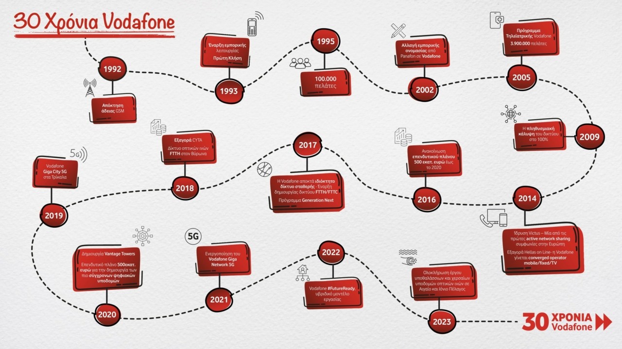 H Vodafone ξεκίνησε την εμπορική της λειτουργία το 1993, ως εταιρεία παροχής εταιρεία παροχής υπηρεσιών κινητής τηλεφωνίας, η πρώτη στην Ελλάδα. Από τότε και έως σήμερα, 30 χρόνια μετά, ως ένας fully converged πάροχος ολοκληρωμένων υπηρεσιών τηλεπικοινωνιών, τεχνολογίας και ψυχαγωγίας, η Vodafone παραμένει πιστή στη δέσμευση της, να βρίσκεται πάντα ένα βήμα μπροστά στις εξελίξεις και να καλύπτει τις ανάγκες πολιτών και επιχειρήσεων.