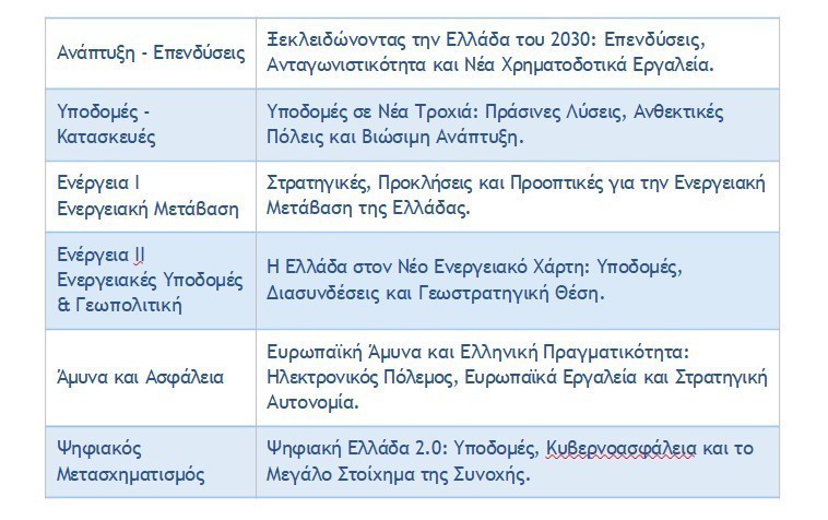 Σε συντονισμό με τις προτεραιότητες της αγοράς και τις διεθνείς τάσεις, το 8ο AIF παρουσιάζει μια θεματολογία αιχμής, με σταθερούς πυλώνες τις ενότητες Ανάπτυξη – Επενδύσεις, Υποδομές – Κατασκευές, Ενέργεια και Ψηφιακός Μετασχηματισμός. Φέτος, εισάγεται για πρώτη φορά η ενότητα Άμυνα και Ασφάλεια, υπογραμμίζοντας τη σημασία ενός τομέα που αποκτά ολοένα και μεγαλύτερη βαρύτητα στην Ευρώπη και διεθνώς. Η ενότητα θα επικεντρωθεί στη συμβολή της άμυνας στην ενίσχυση της εθνικής ασφάλειας, την τεχνολογική αυτοδυναμία και την αξιοποίηση ευρωπαϊκών εργαλείων συνεργασίας, αναδεικνύοντας τον ρόλο της Ελλάδας ως αξιόπιστου εταίρου σε μια εποχή γεωπολιτικής ρευστότητας.