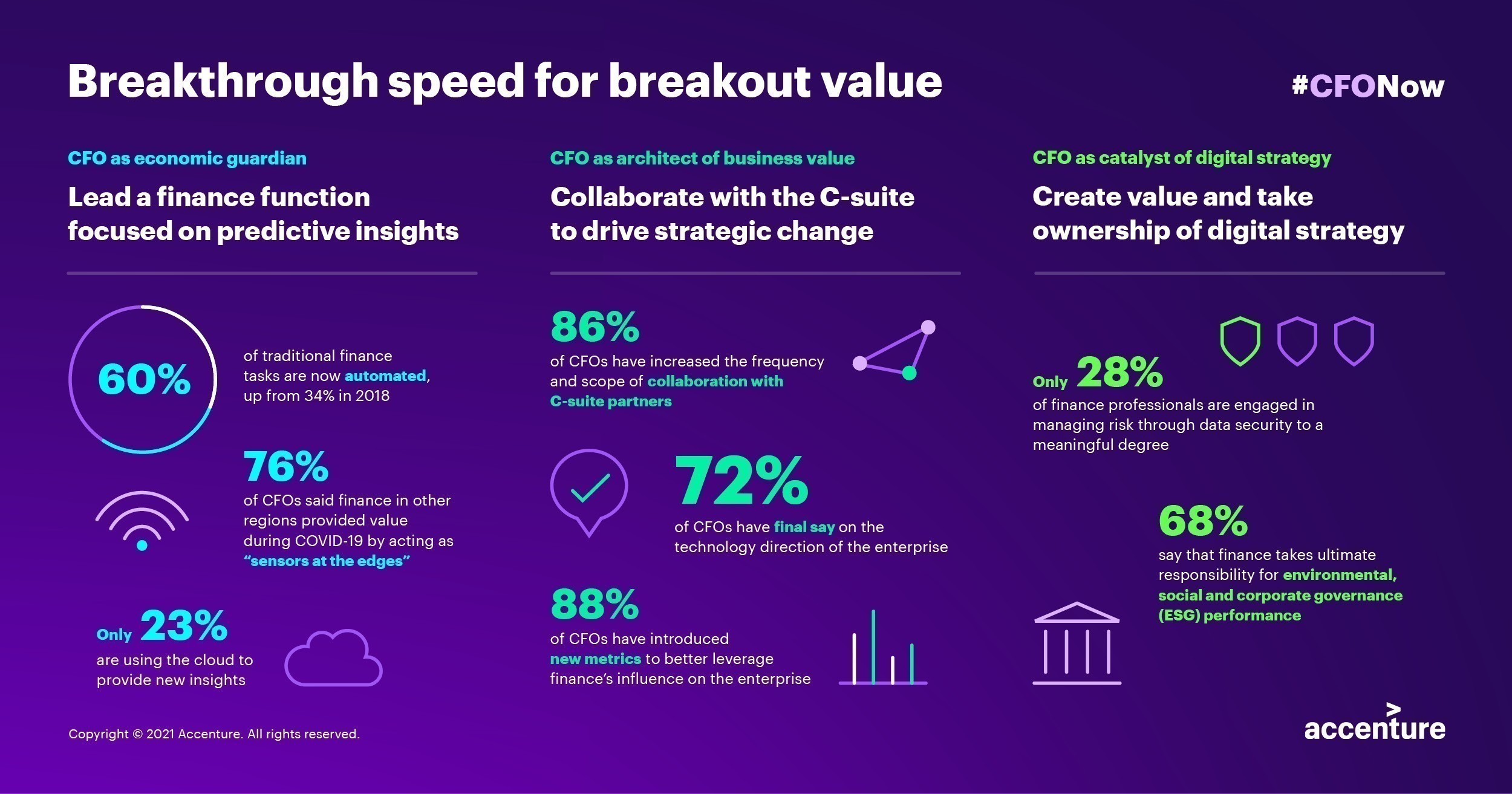 Σύμφωνα με τη μελέτη “CFO Now: Breakthrough Speed for Breakout Value” διαπιστώνεται ότι πέρα από την πανδημία, άλλες εξωτερικές προκλήσεις, όπως η ψηφιοποίηση, η δυναμική της αγοράς και οι ταχέως εξελισσόμενες προσδοκίες των καταναλωτών έχουν ωθήσει τους CFOs να διευρύνουν και να μετασχηματίσουν το ρόλο τους. Οι CFOs καλούνται πλέον να διασφαλίσουν ότι η επιχείρησή τους διαμοιράζει και μειώνει τον κίνδυνο με κατάλληλο τρόπο,απαντώντας σε θέματα αναφορικά με το περιβάλλον, την κοινωνία και την εταιρική διακυβέρνηση (ESG), αλλά και σε θέματα ασφάλειας που αντιμετωπίζουν οι επιχειρήσεις τους.