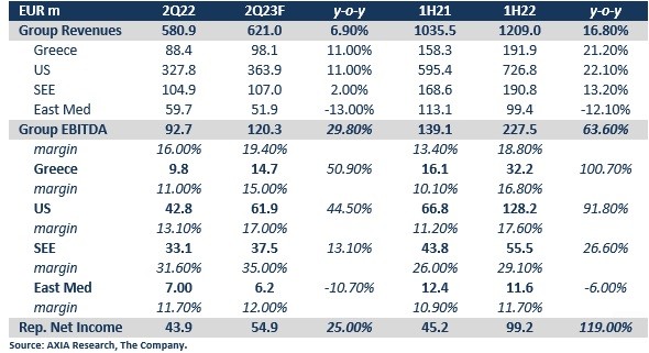 Τα καθαρά κέρδη, ως εκ τούτου, αναμένεται να διαμορφωθούν σε 54,9 εκατ. ευρώ έναντι 43,9 εκατ. ευρώ στο β’ τρίμηνο του 2022.