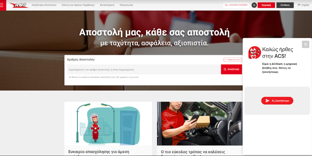 Η ACiStant εμφανίζεται σταθερά στο δεξί κάτω μέρος του site www.acscourier.net, ανοίγει με ένα «χτύπημα» στο σχετικό εικονίδιο και εξυπηρετεί τον επισκέπτη, τόσο στα Ελληνικά, όσο και στα Αγγλικά, στα εξής θέματα: