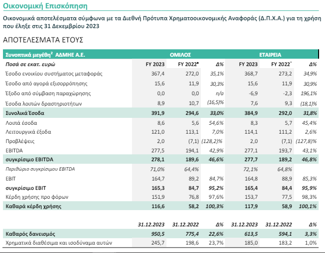 Το ενοποιημένο EBIT ανήλθε σε 164,7 εκατ. ευρώ, έναντι 89,2 εκατ. ευρώ το 2022 αυξημένο κατά 84,7%, με τις αποσβέσεις να αυξάνονται κατά 7,4% στα 112,7 εκατ. ευρώ, γεγονός που οφείλεται στην κεφαλαιοποίηση έργων.