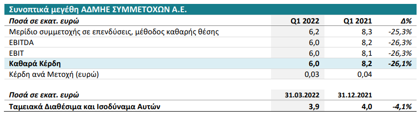 Τα Καθαρά Κέρδη της ΑΔΜΗΕ ΣΥΜΜΕΤΟΧΩΝ Α.Ε. ανήλθαν σε 6,0 εκατ. ευρώ σημειώνοντας μείωση 26,1% έναντι 8,2 εκατ. το α΄ τρίμηνο 2021. Η Εταιρεία βάσει του μερίσματος που έχει λάβει από την συνδεδεμένη εταιρεία ΑΔΜΗΕ Α.Ε. ποσού 17,3 εκατ. ευρώ, τον Απρίλιο ’22 πρότεινε τη διανομή του μέγιστου επιτρεπόμενου μεικτού προμερίσματος ύψους 0,068 ευρώ ανά μετοχή.