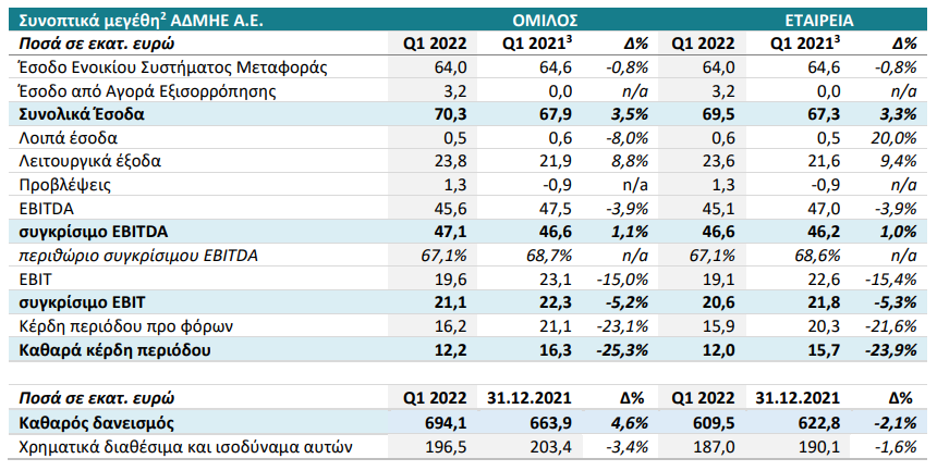 Η εταιρεία «ΑΝΕΞΑΡΤΗΤΟΣ ΔΙΑΧΕΙΡΙΣΤΗΣ ΜΕΤΑΦΟΡΑΣ ΗΛΕΚΤΡΙΚΗΣ ΕΝΕΡΓΕΙΑΣ Α.Ε. (ΑΔΜΗΕ Α.Ε.)» εφεξής «η Συγγενής» παρείχε επίσης τις κάτωθι χρηματοοικονομικές πληροφορίες σύμφωνα με τα Διεθνή Πρότυπα Χρηματοοικονομικής Αναφοράς (Δ.Π.Χ.Α.) για την τρίμηνη περίοδο που έληξε στις 31 Μαρτίου 2022: