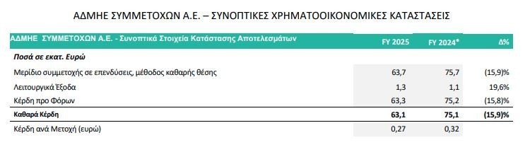 Ειδικότερα, τα έσοδα της εταιρείας διαμορφώθηκαν στα 63,7 εκατ. ευρώ, σημειώνοντας πτώση 15,9% σε σύγκριση με το 2024, καθώς αντικατοπτρίζουν τη συμμετοχή της κατά 51% στα κέρδη του Ομίλου ΑΔΜΗΕ.