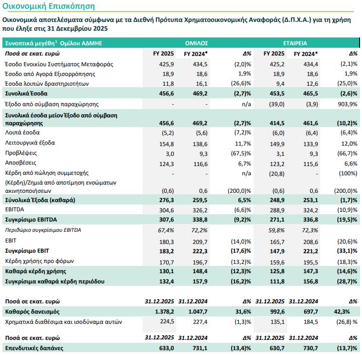 Ήπια υποχώρηση εσόδων, αλλά πιο έντονη πίεση στην κερδοφορία, λόγω αύξησης των λειτουργικών εξόδων και επιβάρυνσης από αποσβέσεις παρουσιάζει η οικονομική εικόνα του Ομίλου ΑΔΜΗΕ για τη χρήση 2025.