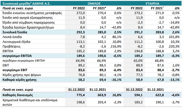 Τα ενοποιημένα συνολικά έσοδα του Ομίλου το 4ο τρίμηνο του 2022 αυξήθηκαν κατά 13,3%, σε σύγκριση με το προηγούμενο έτος και διαμορφώθηκαν στα 81,3 εκατ. ευρώ, γεγονός που αντικατοπτρίζει την εφαρμογή των νέων χρεώσεων χρήσης συστήματος σε όλο το τρίμηνο. Τα ενοποιημένα κέρδη προ τόκων, φόρων και αποσβέσεων (EBITDA) το 4ο τρίμηνο του 2022 ανήλθαν στα 51,5 εκατ. ευρώ σημειώνοντας αύξηση κατά 18,2% σε ετήσια βάση έναντι 43,6 εκατ. ευρώ το 4ο τρίμηνο 2021.