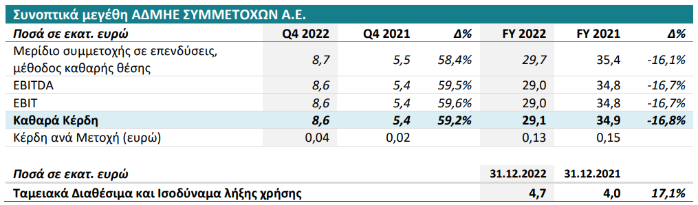 Η ΑΔΜΗΕ ΣΥΜΜΕΤΟΧΩΝ Α.Ε. (RIC: ADMr.AT, Bloomberg: ADMIE.GA, Χρηματιστήριο Αθηνών: ΑΔΜΗΕ) εφεξής «η Εταιρεία» κάτοχος του 51% των μετοχών του Ομίλου της ΑΔΜΗΕ Α.Ε., δημοσιεύει σήμερα τα οικονομικά αποτελέσματα σύμφωνα με τα Διεθνή Πρότυπα Χρηματοοικονομικής Αναφοράς (Δ.Π.Χ.Α.) για τη χρήση που έληξε στις 31 Δεκεμβρίου 2022.