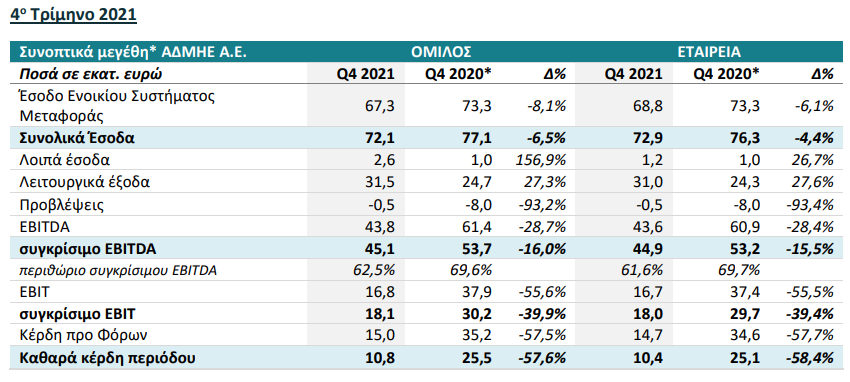 Τα ενοποιημένα κέρδη προ τόκων, φόρων και αποσβέσεων (EBITDA)* το 4ο τρίμηνο του 2021 ανήλθαν στα 43,8 εκατ. ευρώ σημειώνοντας μείωση κατά 28,7% σε ετήσια βάση έναντι 61,4 εκατ. ευρώ το 4ο τρίμηνο 2020. Το συγκρίσιμο EBITDA του Ομίλου διαμορφώθηκε στα 45,1 εκατ. ευρώ, χαμηλότερα κατά 16% σε σχέση με το αντίστοιχο ποσό του 4ου τριμήνου του 2020, μη συμπεριλαμβάνοντας τις ακόλουθες προβλέψεις: