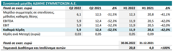 Η ΑΔΜΗΕ ΣΥΜΜΕΤΟΧΩΝ Α.Ε. (RIC: ADMr.AT, Bloomberg: ADMIE.GA, Χρηματιστήριο Αθηνών: ΑΔΜΗΕ) εφεξής «η Εταιρεία» κάτοχος του 51% των μετοχών του Ομίλου της ΑΔΜΗΕ Α.Ε., δημοσιεύει σήμερα τα οικονομικά αποτελέσματα σύμφωνα με τα Διεθνή Πρότυπα Χρηματοοικονομικής Αναφοράς (Δ.Π.Χ.Α.) για την περίοδο που έληξε στις 30 Ιουνίου 2022.