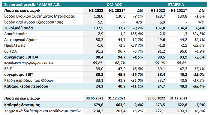 Η εταιρεία «ΑΝΕΞΑΡΤΗΤΟΣ ΔΙΑΧΕΙΡΙΣΤΗΣ ΜΕΤΑΦΟΡΑΣ ΗΛΕΚΤΡΙΚΗΣ ΕΝΕΡΓΕΙΑΣ Α.Ε. (ΑΔΜΗΕ Α.Ε.)» εφεξής «η Συγγενής» ανακοίνωσε επίσης τις κάτωθι χρηματοοικονομικές πληροφορίες σύμφωνα με τα Διεθνή Πρότυπα Χρηματοοικονομικής Αναφοράς (Δ.Π.Χ.Α.) για την εξάμηνη περίοδο που έληξε στις 30 Ιουνίου 2022: