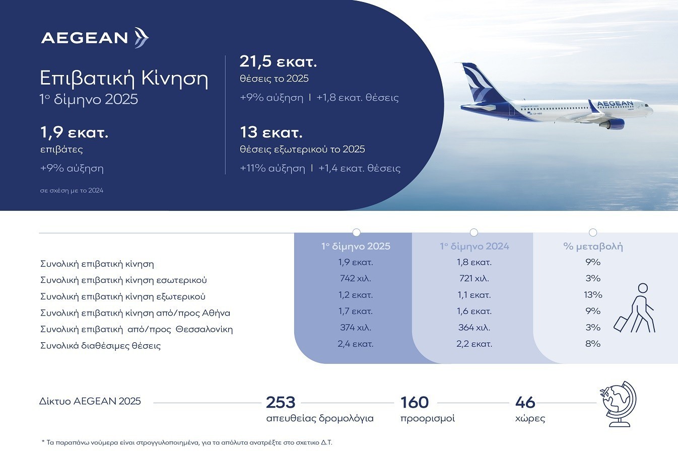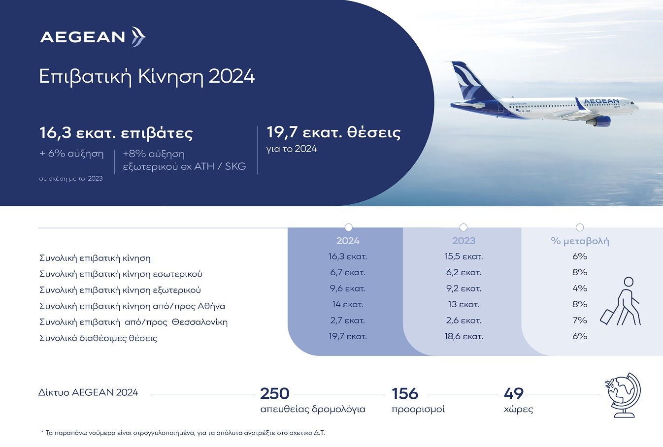 Συνολικά το 2024 η AEGEAN μετέφερε 16,3 εκατ. επιβάτες, καταγράφοντας για το 2024 ετήσια αύξηση 6% σε σχέση με το 2023, έχοντας προσφέρει περισσότερες από 19,7 εκατ. θέσεις, αυξημένες κατά 1,1 εκατ. παρά τις επιχειρησιακές και γεωπολιτικές προκλήσεις και κατέγραψε ένα ακόμη, νέο ιστορικό υψηλό στην επιβατική κίνηση της εταιρείας.