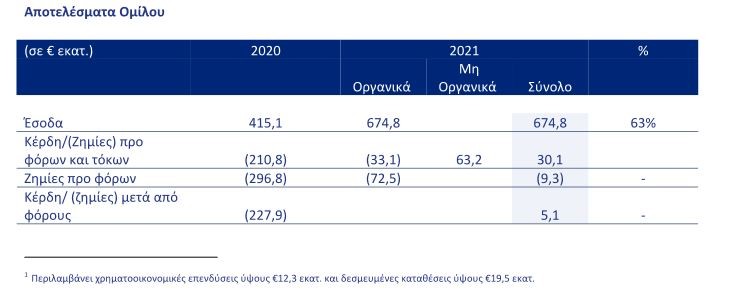 Λαμβάνοντας υπόψη τα ανωτέρω έκτακτα μη οργανικά έσοδα, οι Ζημίες προ Φόρων ανήλθαν σε €9,3 εκατ. το 2021, ενώ ο Όμιλος εμφάνισε καθαρά κέρδη μετά από φόρους ύψους €5,1 εκατ.