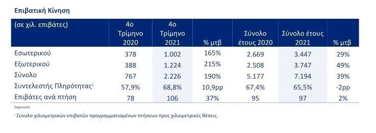 Ο Όμιλος προσέφερε 11,2 εκατ. θέσεις και μετέφερε 7,2 εκατ. επιβάτες συνολικά, με την κίνηση να ανέρχεται σε 3,5 εκατ. επιβάτες στο δίκτυο εσωτερικού και 3,7 εκατ. επιβάτες στο δίκτυο εξωτερικού το 2021. Ο συντελεστής πληρότητας διαμορφώθηκε στο 65,5% στα ίδια περίπου επίπεδα με το 2020 και σημαντικά χαμηλότερα από τα συνήθη προ πανδημίας.