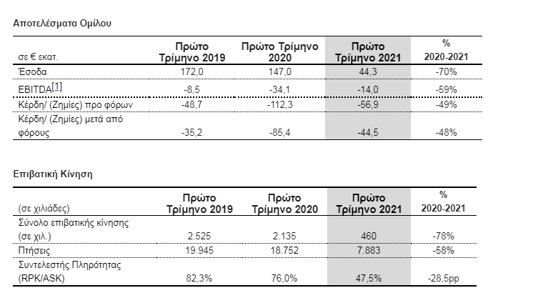 «Η πτητική δραστηριότητα του Ομίλου κυμάνθηκε σε ιδιαίτερα χαμηλά επίπεδα το πρώτο τρίμηνο του 2021, λόγω του δεύτερου κύματος της πανδημίας και των περιορισμών, επηρεάζοντας τα αποτελέσματά μας. Αντίστοιχη ήταν και η πορεία του δεύτερου τριμήνου έως και τις αρχές Ιουνίου. Σε επίπεδο ταμειακών ροών όπως έχουμε ήδη δηλώσει, λόγω των προπωλήσεων εισιτηρίων σημειώθηκε θετικό πρόσημο από τον Μάϊο του 2021 μέχρι σήμερα.