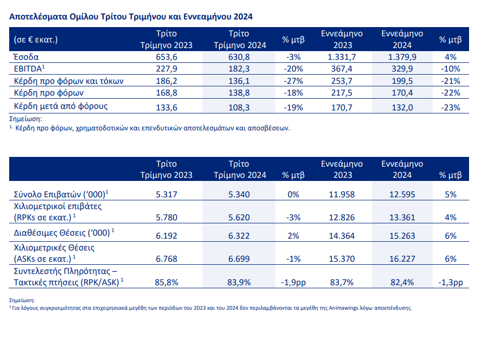 Με τους ανωτέρω περιορισμούς, το Γ’ τρίμηνο η ΑΕGEAN προσέφερε 6,3 εκατ. διαθέσιμες θέσεις, 2% περισσότερες από το Γ’ τρίμηνο του 2023 ενώ μετέφερε 5,3 εκατ. επιβάτες. Η επιβατική κίνηση στο δίκτυο εσωτερικού κατέγραψε αύξηση 6%, ενώ η επιβατική κίνηση του δικτύου εξωτερικού σημείωσε κάμψη 3% σε σχέση με το αντίστοιχο διάστημα του 2023 απόρροια της έκτακτης αναστολής των πτήσεων σε Ισραήλ και Λίβανο. Ο συντελεστής πληρότητας διαμορφώθηκε στο 83,9%. Ο ενοποιημένος κύκλος εργασιών για το Γ’ Τρίμηνο ανήλθε σε €630,8 εκατ. Το ΕΒΙΤDA διαμορφώθηκε στα €182,3 εκατ. με το τελικό αποτέλεσμα να διαμορφώνεται σε Κέρδη προ Φόρων €138,8 εκατ. και σε Κέρδη μετά από Φόρους €108,3 εκατ. από €133,6 εκατ. το Γ’ Τρίμηνο του 2023, μειωμένα κατά 19%.