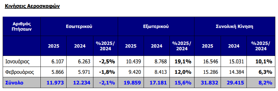 Ο αριθμός των πτήσεων στον Διεθνή Αερολιμένα Αθηνών κατά τη διάρκεια των δύο πρώτων μηνών του 2025 ανήλθε σε 31.832, καταγράφοντας αύξηση της τάξης του 8,2% σε σχέση με το 2024.