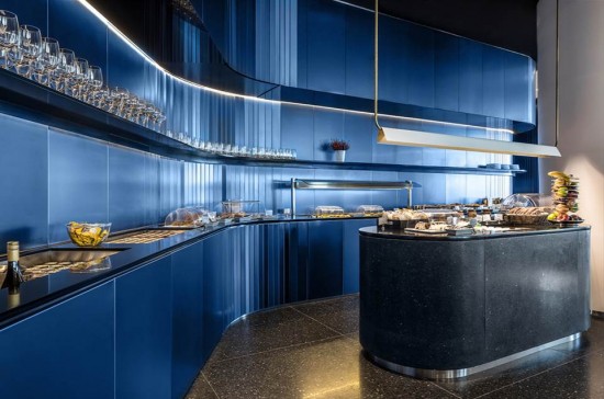 Οι καμπύλες μορφές που κυριαρχούν σε συνδυασμό με τα υλικά υψηλής ποιότητας όπως το μάρμαρο, το μωσαϊκό, το γυαλί και το ξύλο δημιουργούν ένα σύγχρονο και μοντέρνο χώρο που εστιάζει αποκλειστικά στην άνεση και τη φιλοξενία, ενώ η ειδική πύλη μέσα στο lounge εξασφαλίζει την απευθείας επιβίβαση στο αεροσκάφος.