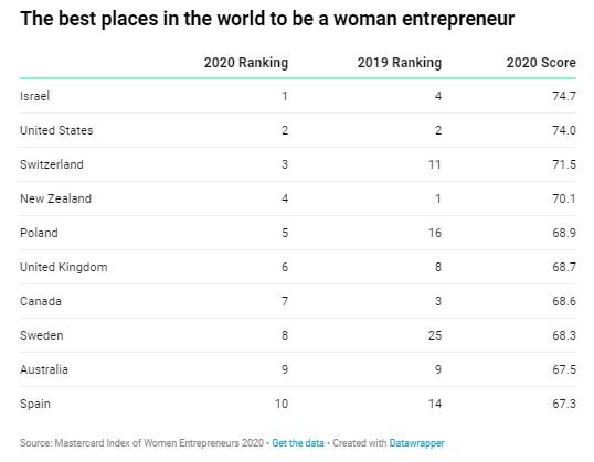 Για πρώτη φορά στην δεκάδα βρίσκονται χώρες όπως η Πολωνία, η Σουηδία και η Ισπανία δημιουργώντας με τον τρόπο αυτό μια λίστα με αρκετά διαφορετικές γεωγραφικές χώρες. Το Ηνωμένο Βασίλειο, ο Καναδάς και η Αυστραλία συμπληρώνουν τις κορυφαίες 10 χώρες, καθώς οι οικονομίες υψηλού εισοδήματος τα πήγαν καλύτερα για τις γυναίκες επιχειρηματίες κατά τη διάρκεια της πανδημίας.
