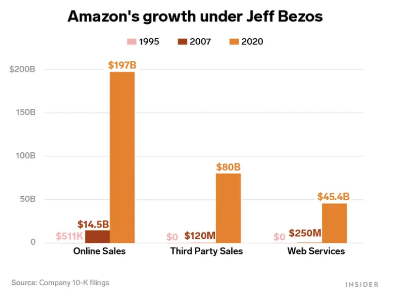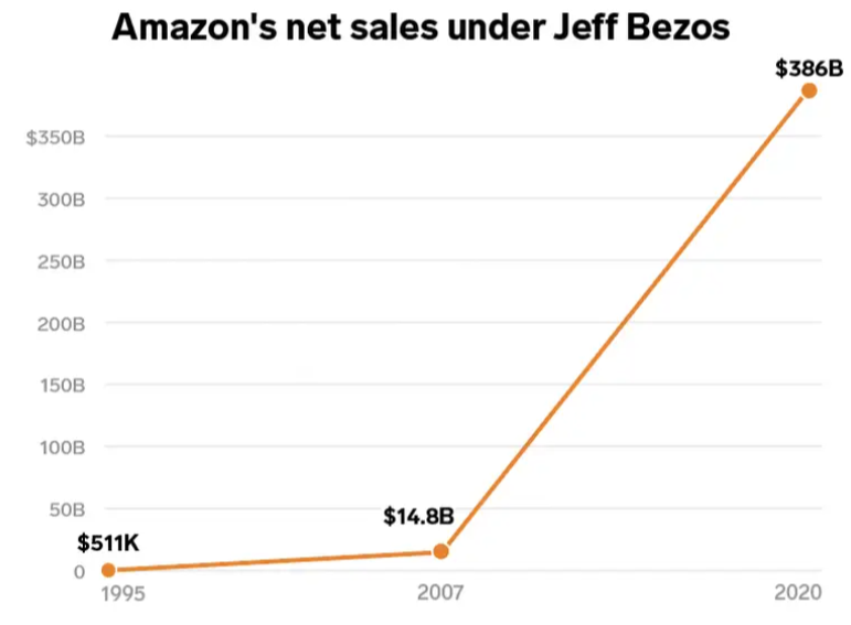 Στη διάρκεια που ο Τζεφ Μπέζος υπηρέτησε ως διευθύνων σύμβουλος της Amazon και συγκεκριμένα από το 1995 έως το 2020, οι συνολικές πωλήσεις της εταιρείας αυξήθηκαν περισσότερες από 772.000 φορές.